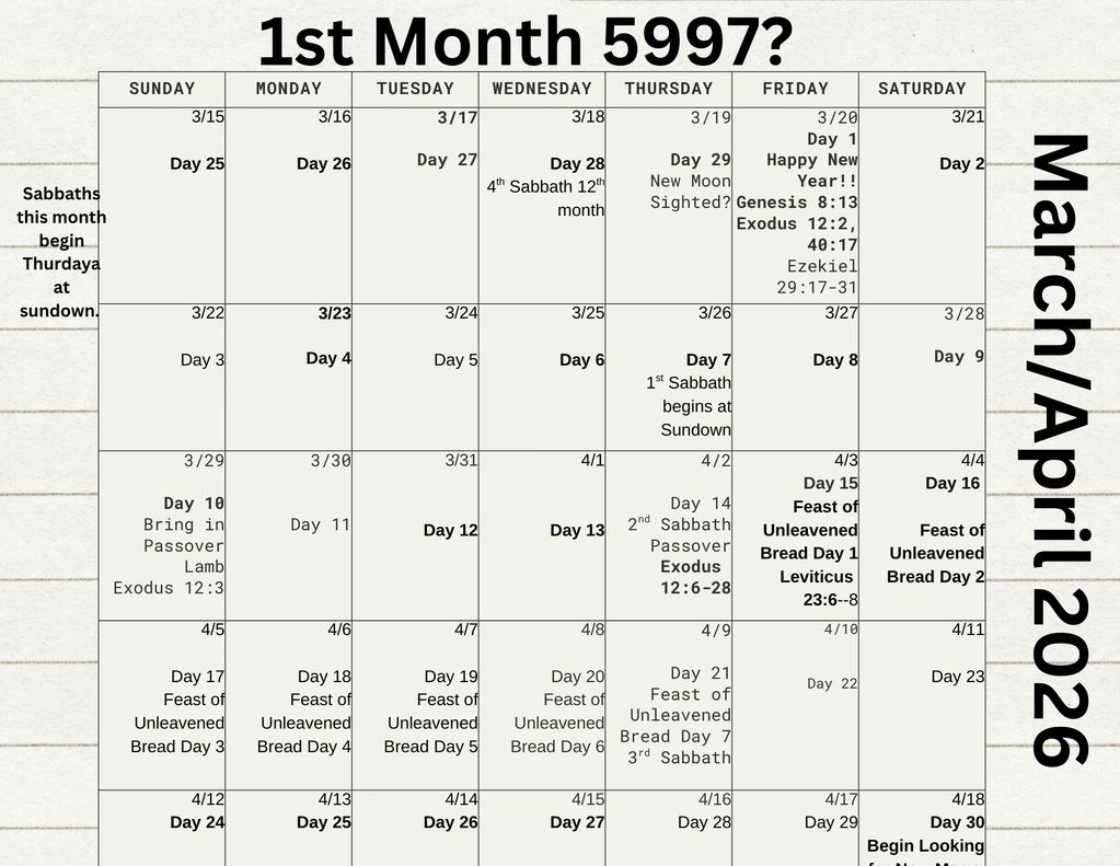 Do you know what today 📆is⁉️ Getting in alignment with Biblical times & seasons! Here is the calendar for the 1st month. Remember we have Passover, First Fruits & Feast of Unleavened Bread this month.
